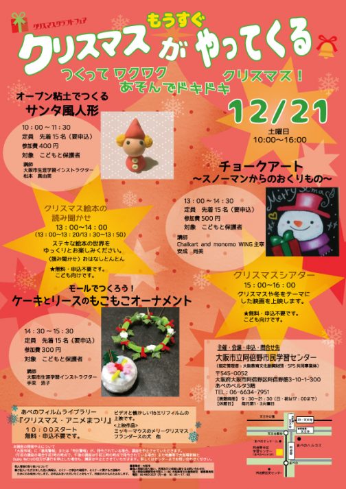 もうすぐクリスマスがやってくる!クリスマスクラフトフェア 申し込み期間 2019年11月10日(日) 〜 2019年12月21日(土) イベント・その他 クリスマスがもうすぐやってくる!つくってワクワク・あそんでドキドキのクリスマスイベントです。クリスマスにぴったりの作品をつくったり、絵本や映画で楽しみませんか? ①オーブン粘土でつくるサンタ風人形10:00~11:30定員15人(先着順)参加費400円 ②チョークアート~スノ...