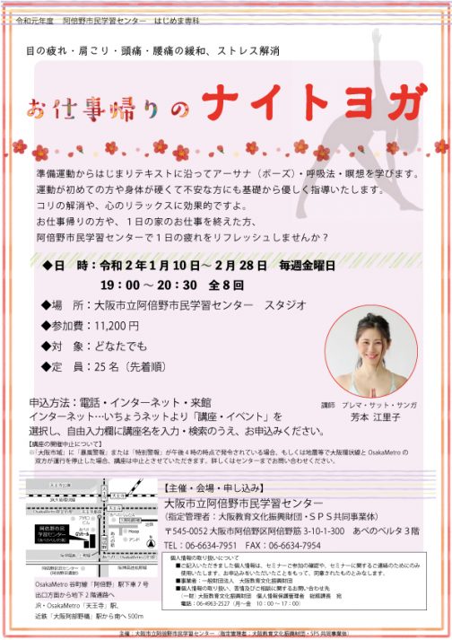 お仕事帰りのナイトヨガ 申し込み期間 2019年11月10日(日) 〜 2020年1月9日(木) カルチャー チラシはこちら 準備運動から始まりテキストに沿って アーサナ(ポーズ)・呼吸法・瞑想を学びます。 運動が初めての方や身体が硬くて不安な方にも 基礎からやさしく指導いたします。 コリの解消や、心のリラックスに効果的です。 お仕事帰りの方や、1日の家のお仕事を終えた方、 ...