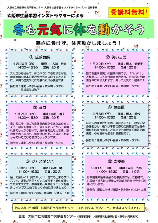 冬も元気に体を動かそう 申し込み期間 2019年11月10日(日) 〜 2020年2月18日(火) カルチャー ①琉球舞踊 1月20日(月)14:00~15:30 ②笑いヨガ 1月22日(水) 14:00~15:30 ③ヨガ 1月29日(水)14:00~15:30 ④健美操 2月3日(月)14:00~15:30 ⑤ジャズダンス 2月5日(水)14:00~15:30 ⑥太極拳 2月19日(水...