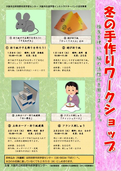 冬の手作りワークショップ 申し込み期間 2019年11月10日(日) 〜 2020年2月19日(水) カルチャー ①折り紙で干支飾りを作ろう! 1月9日(木)10:00~11:30 ②遊び折り紙 1月16日(木)10:00~11:30 ③立体カード・折り紙建築 2月13日(木)10:00~11:30 ④フランス刺しゅう 2月20日(木)10:00~11:30 →チラシ←...