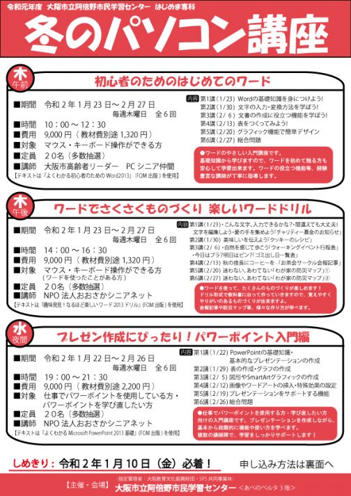 冬のパソコン講座 申し込み期間 2019年11月10日(日) 〜 2020年1月10日(金) カルチャー チラシ(表) チラシ(裏) ★令和2年1月から2月にかけてのパソコン講座です。 ○「初心者のためのはじめてのワード」 ワードをはじめたい・学んでみたい方向けの、やさしいワード講座です。 文書作成に役立つ機能や、グラフィック機能で簡単なデザインも学ぶことができます。 ワ...