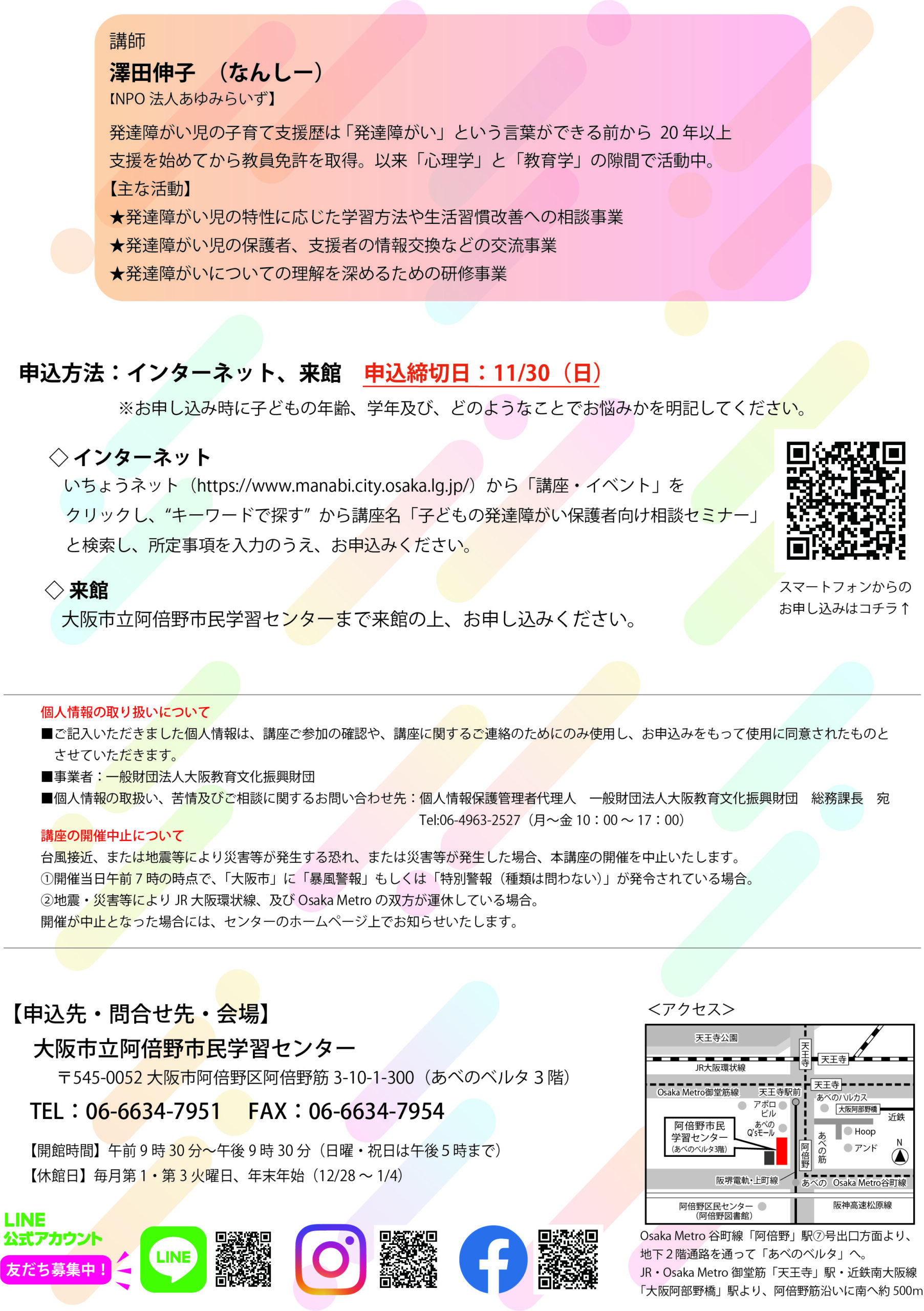 大阪市立阿倍野市民学習センター 〒545-0052 大阪市阿倍野区阿倍野筋3-10-1-300(あべのベルタ3階) TEL:06-6634-7951 FAX:06-6634-7954 開館時間:9:30~21:30(日・祝日は17:00まで) 休館日:毎月第1・3火曜日、年末年始(12/28~1/4) |