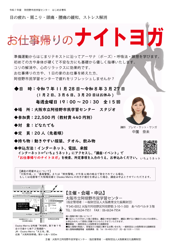 お仕事帰りの方や、1日の家のお仕事を終えた方、阿倍野市民学習センターで疲れをリフレッシュしませんか?