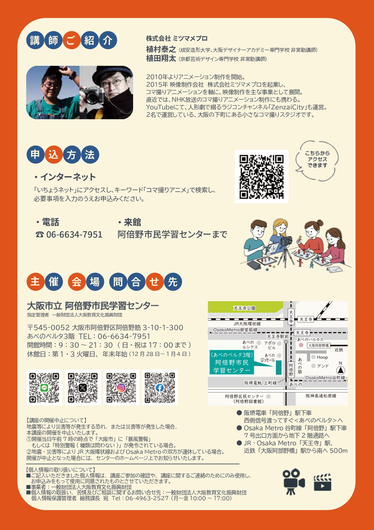 備考 ●持ち物:スマートフォン、タブレット等 カメラ機能付きモバイル端末 ●モバイル端末がない場合、先着順で貸出します。 (5台限定/1組1台まで/電話・来館でのみ受付) ●可能であれば、あらかじめアプリのダウンロードをお願いします。 使用アプリ「Stop Motion Studio」(無料版)通信費は各自でご負担ください。 ●模型の色塗りはアクリル絵の具を使用します。汚れても良い服装でお越しください。 ●参加者全員の作品をつなぎ合わせ、一本のショートムービーを完成させます。阿倍野市民学習センター公式YouTube等にアップしますので、ご協力をお願いします。