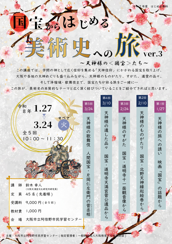 この講座では、学問の神として広く信仰を集める「天神信仰」にかかわる国宝を取り上げ、大阪や各地の天神めぐりも盛り込みながら、天神様のものがたり、すがた、遺愛...