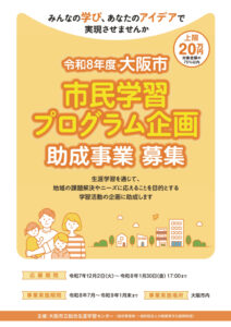 令和7年12月2日より、令和8年度 大阪市「市民学習プログラム企画」助成事業の募集を開始しました。