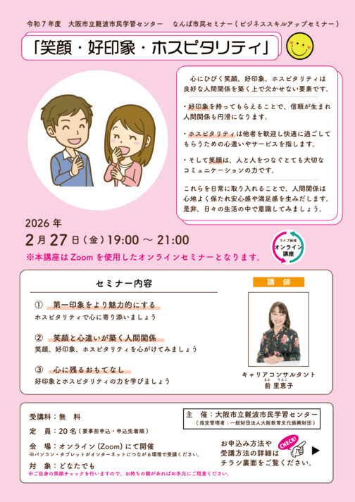 【オンライン受講】「笑顔・好印象・ホスピタリティ」(なんば市民セミナー・ビジ...