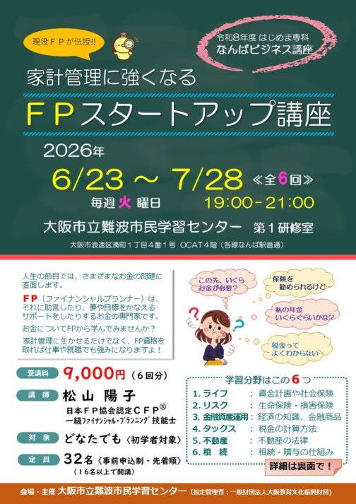 なんばビジネス講座「家計管理に強くなる FPスタートアップ講座」(6月クラス...