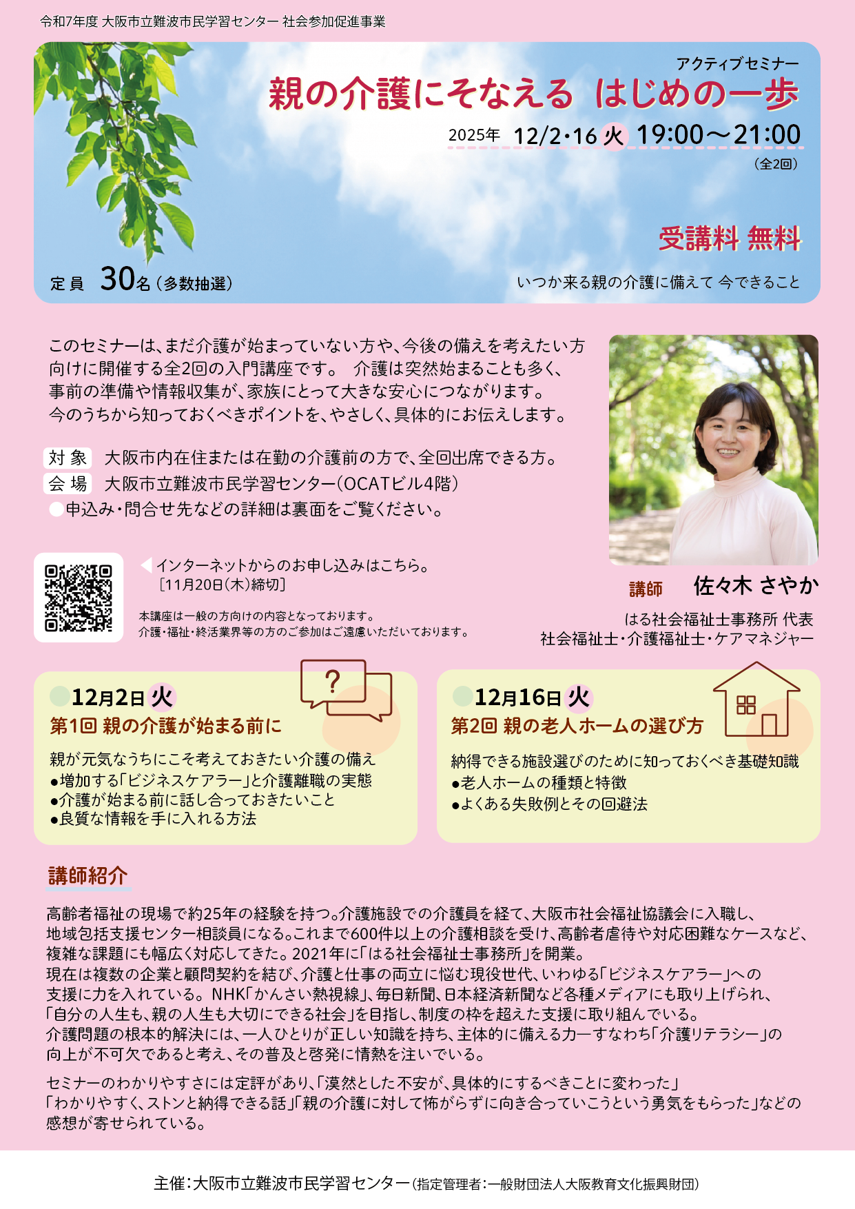 対象 | 大阪市内在住または在勤の介護前の方で、全回出席できる方。 |