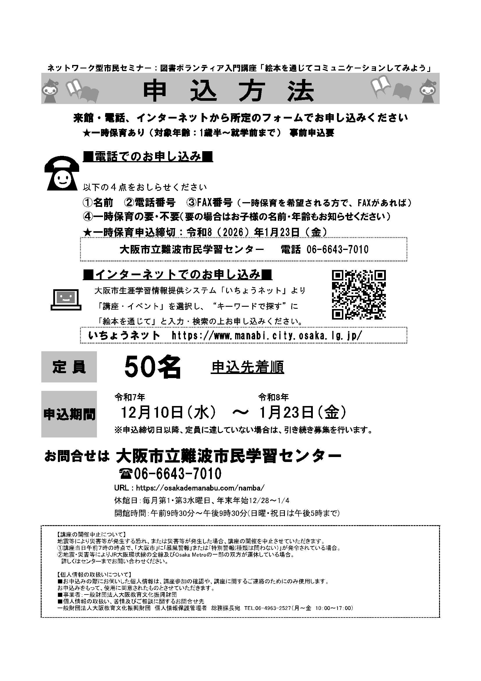 お電話で、大阪市立難波市民学習センターへお申込みください。