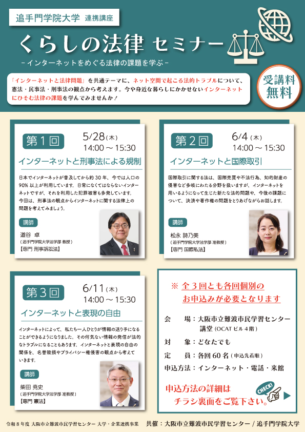 「インターネットと法律問題」を共通テーマに、ネット空間で起こる法的トラブルについて憲法、民事法、刑事法の観点から考えます。今や身近な暮らしにかかせないインターネットにひそむ法律...