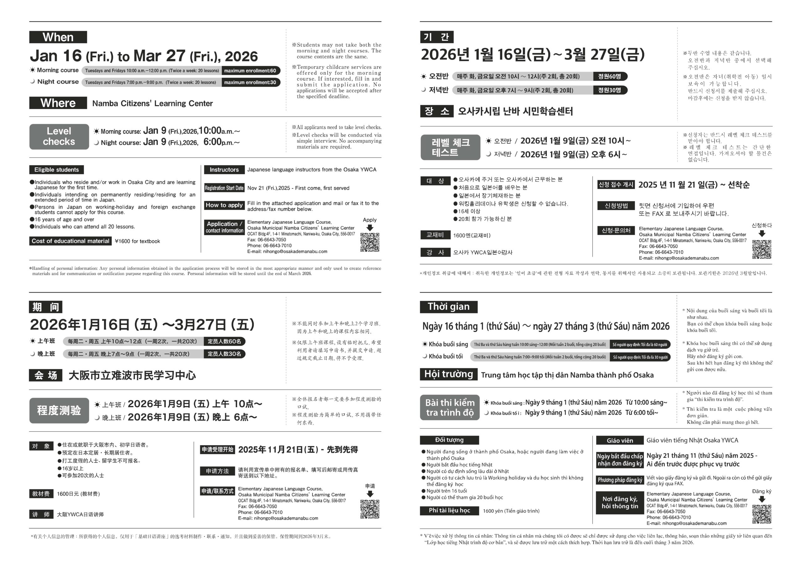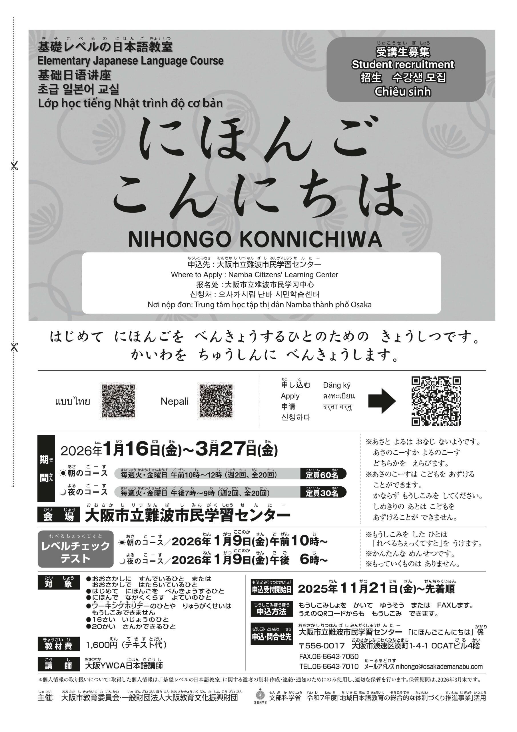 Classes are held in Osaka City Learning Centers or public schools (elementary or junior high)