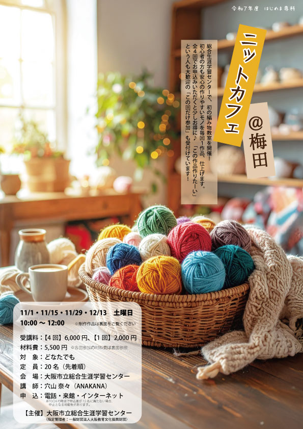 電話・来館・インターネット ◆電話・FAX・来館でのお申し込みは、①講座名 ②名前(ふりがな) ③郵便番号・住所 ④電話番号(FAX番号)をご記入のうえ、総合生涯学習センターまでお申し込みください。 ◆インターネットでのお申し込みはこちら → 「ニットカフェ@梅田」申込フォーム ※お申し込み後、受講案内通知をお送りします。ご案内をお読みのうえ、講座にご参加ください。 |