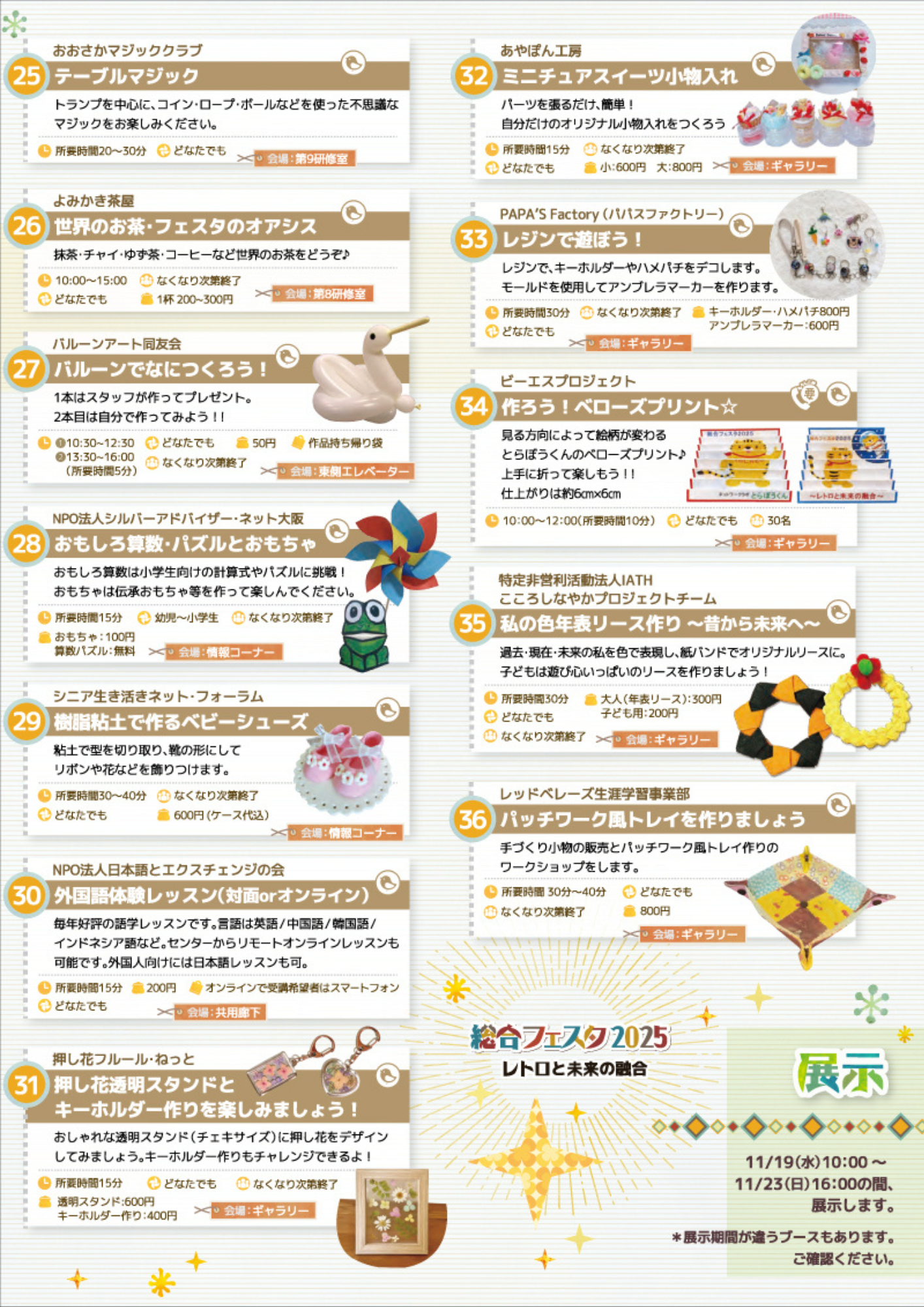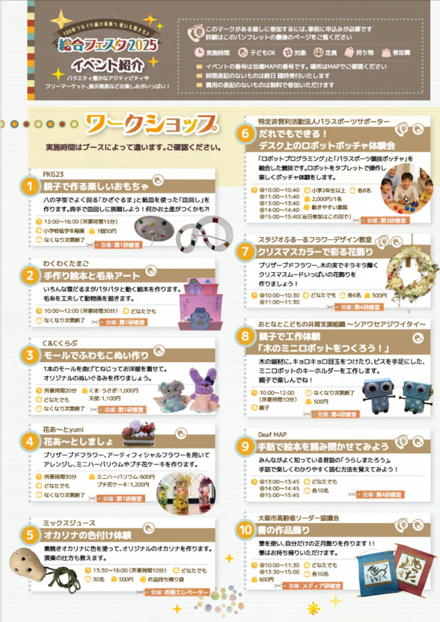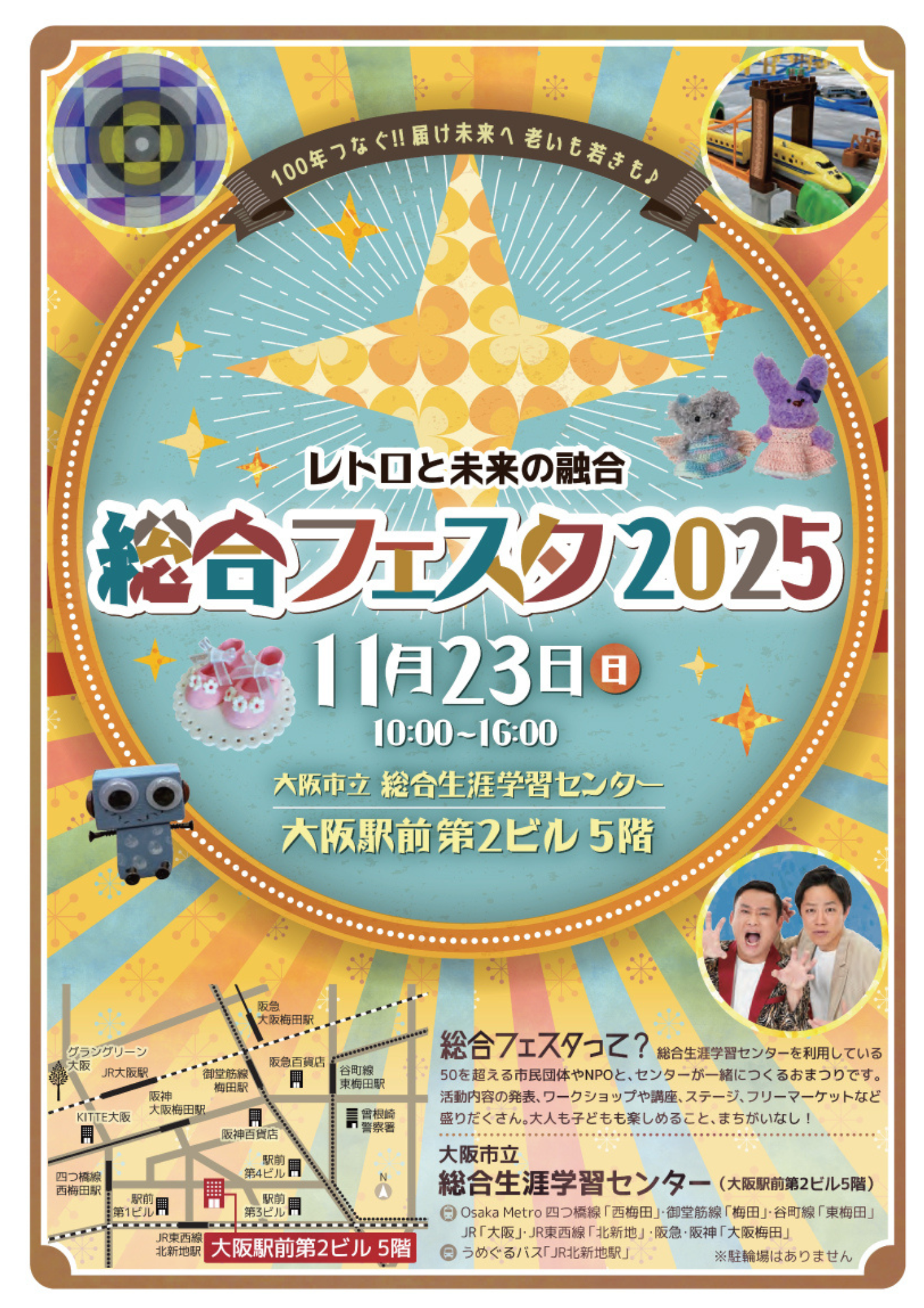総合フェスタは、総合生涯学習センターを利用している市民団体やNPOと、センターが一緒につくるお祭りです。