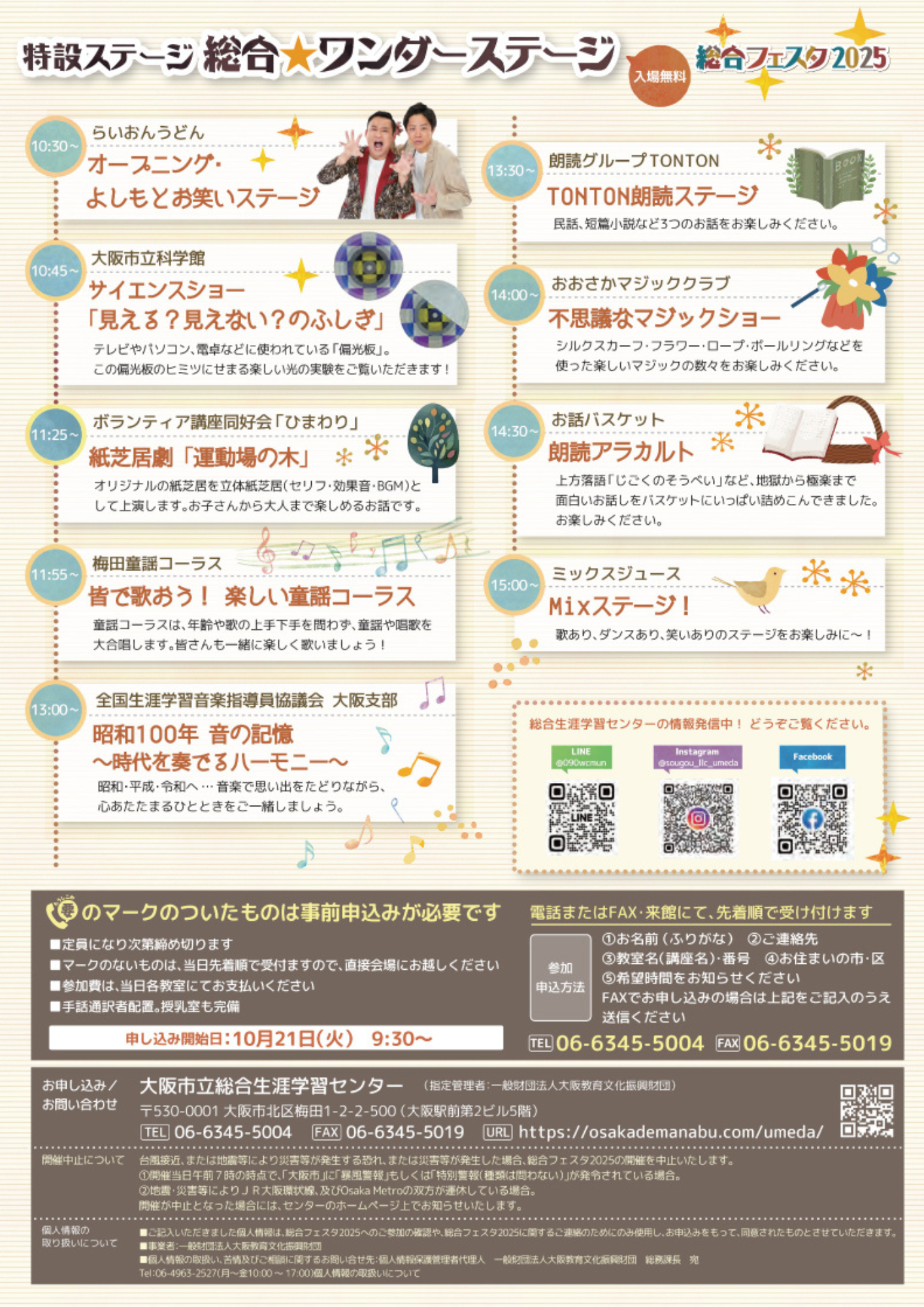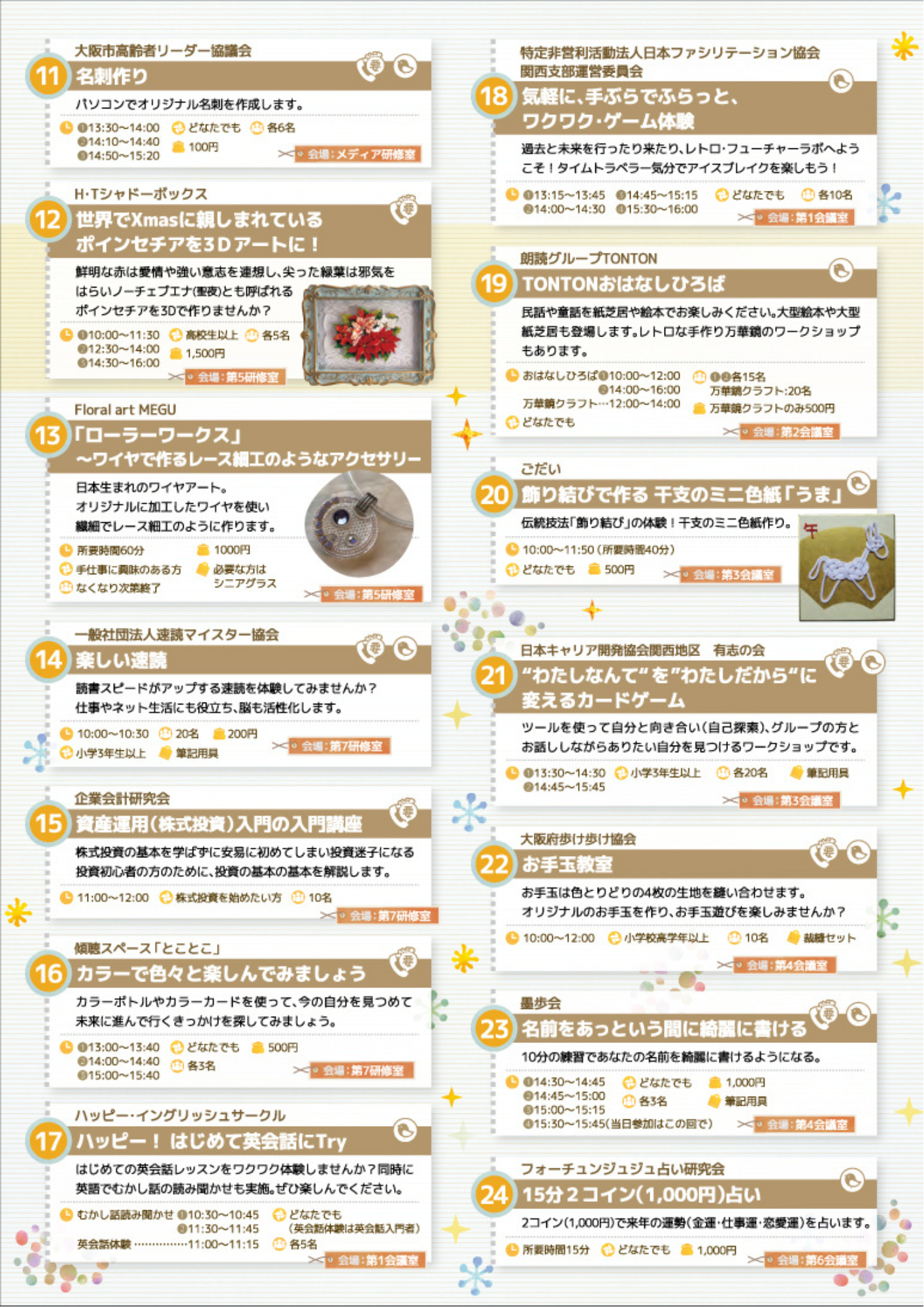 プログラムによっては事前申し込みが必要です。 事前申込受付開始:10月21日(火)9:30より、先着順にて 来館・電話・FAXにて【プログラム名、時間帯、お名前(ふりがな)・電話番号・お住まいの市、区】を明記の上、総合生涯学習センターまでお申し込みください。 |