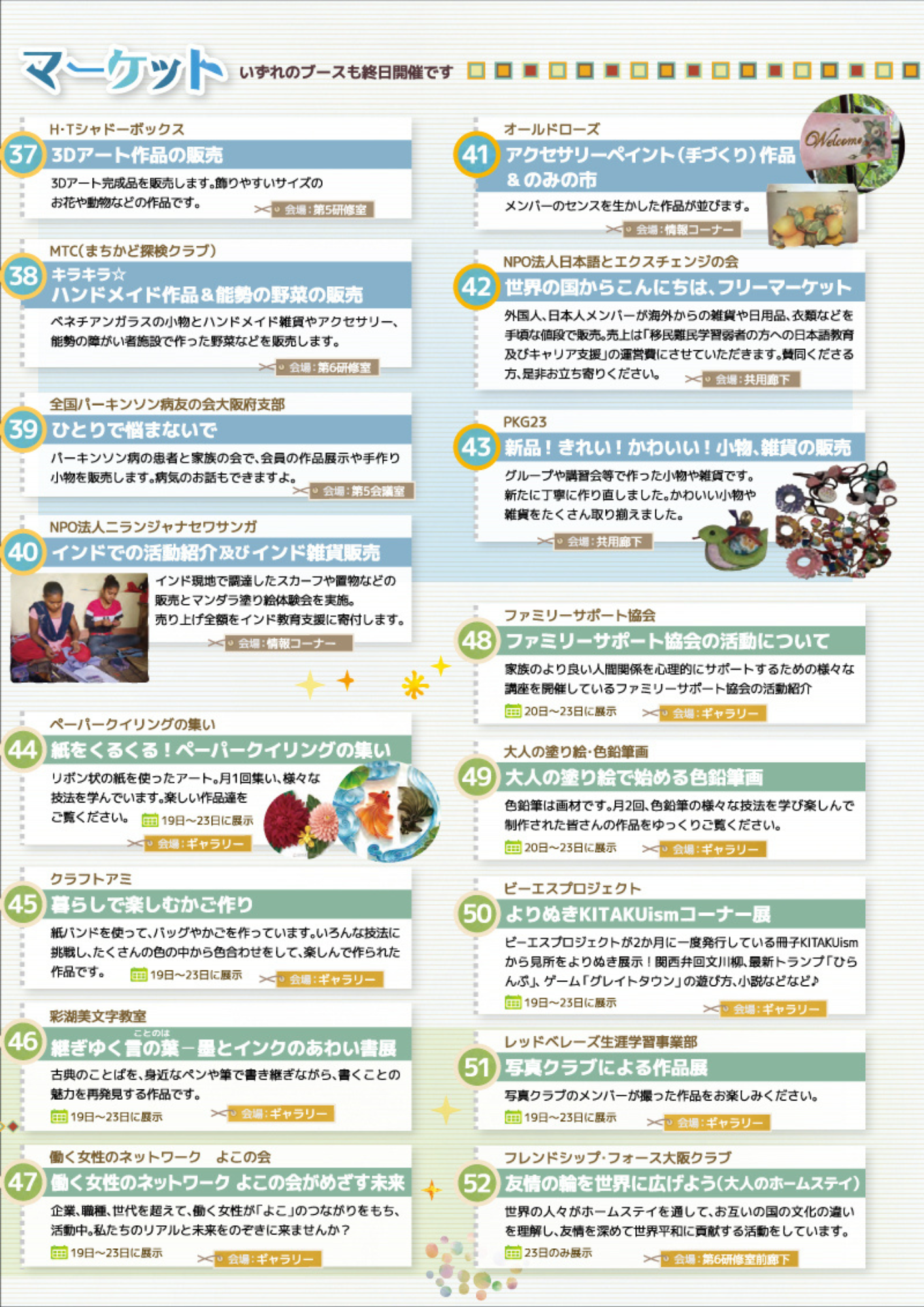 センター利用の市民団体やNPOによる、手づくりおもちゃや木のロボットなどのものづくり・体験教室やワークショップ、作品展示、フリーマーケットなど、約50以上のブースが出店します。(注:一部事前申込必要、有料ブースあり)