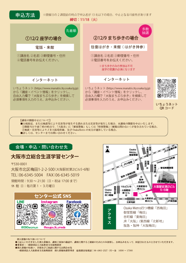 ①12/2 座学の場合 インターネットでのお申込み→「①12/2 鉄道街歩き~天王寺・阿倍野橋~」 ②12/9 まち歩きの場合 インターネットでのお申込み→「②12/9 まち歩き編『天王寺・阿倍野橋』」 ※締切:11/18(火) 【注意】まち歩きのみのお申し込みはできません。必ず、座学をお申込みください。 |