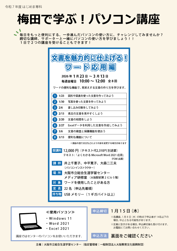 梅田で学ぶ!パソコン講座「文書を魅力的に仕上げる!ワード応用編」