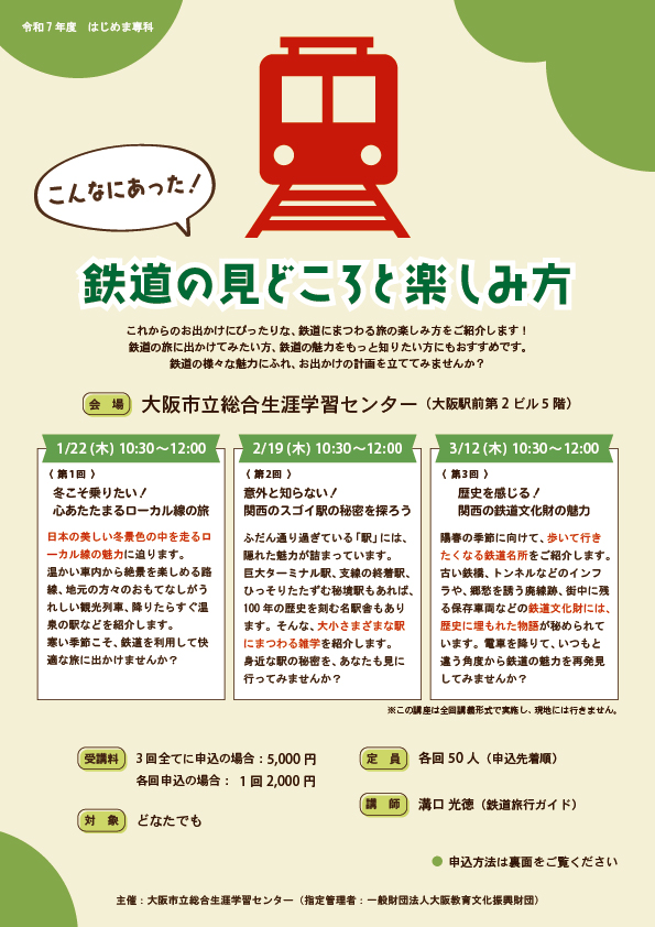 | 開催場所 | 大阪市立総合生涯学習センター 第1研修室(大阪駅前第2ビル5階) |