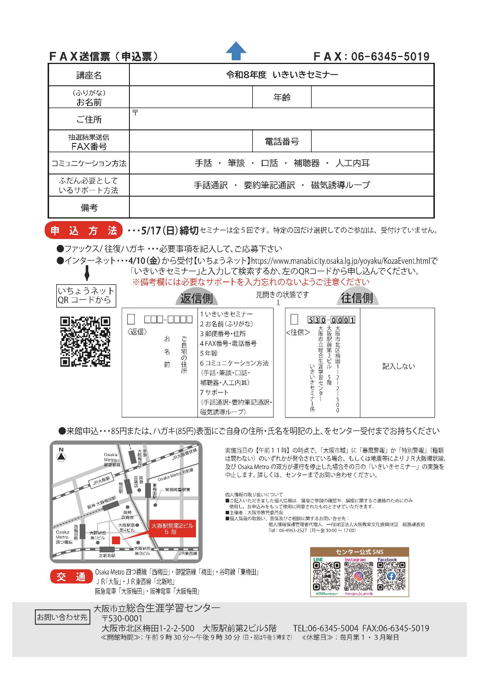 お問い合わせ 大阪市立総合生涯学習センター 聴覚障がい者のためのいきいきセミナー担当 【FAX】06-6345-5019