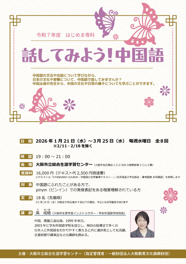 中国語の文法や会話について学びながら、日本の文化や習慣について、中国語で話してみませんか?中国出身の先生から、中国の文化や日常の様子についても学ぶことができます。 チラシ...
