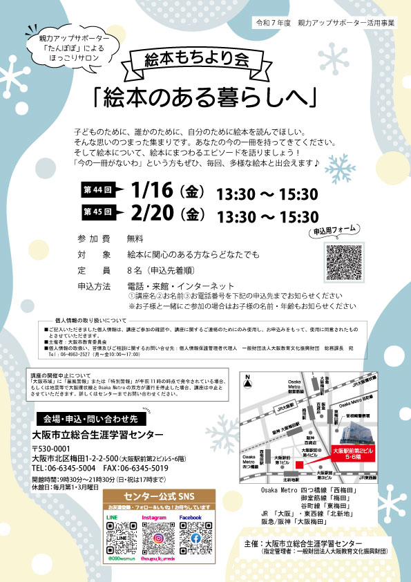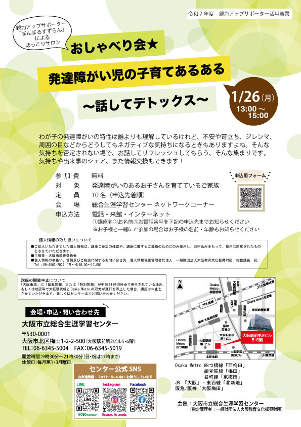 ほっこりサロンは、「大阪市親力アップサポーター」自主グループが運営する、子育てに関わる方々を応援する講座です。安心しておしゃべりできる場所でこころとからだもスッキリしませんか。...