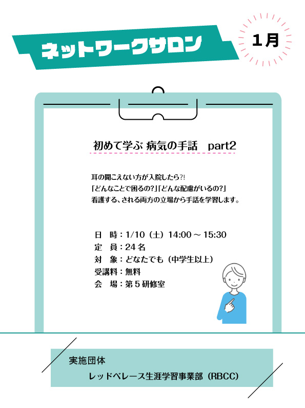 耳の聞こえない方が入院したら⁈「どんなことで困るの?」「どんな配慮がいるの?」看護する、される両方の立場から手話を学習します。 【共催】レッド・ベレー...