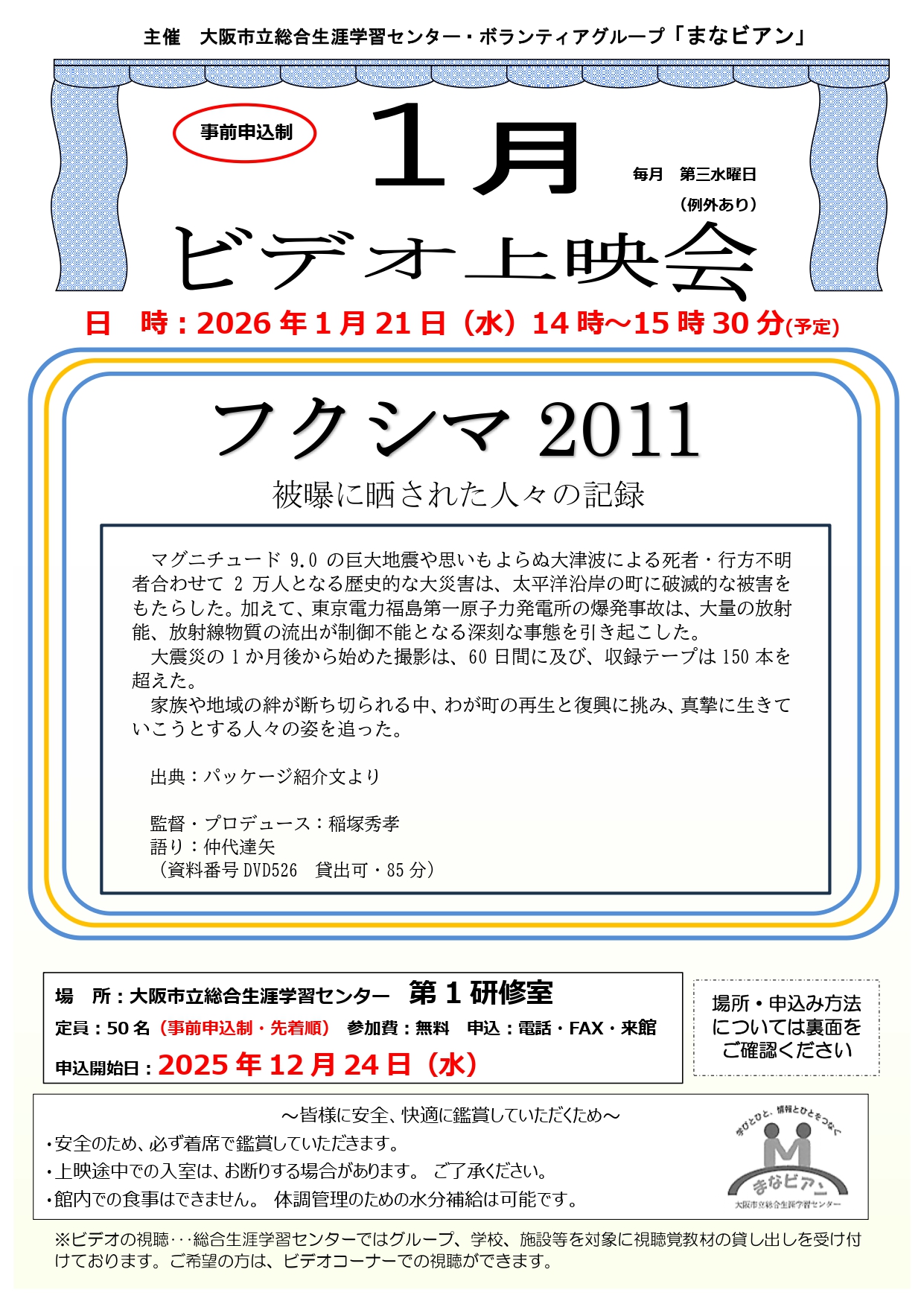 大阪市立総合生涯学習センターでは、施設ボランティアとして「まなビアン」が活動しています。活動内容は「学習情報の収集・整理・提供活動」「ビデオ上映」「イベント等の補助」を行ってい...