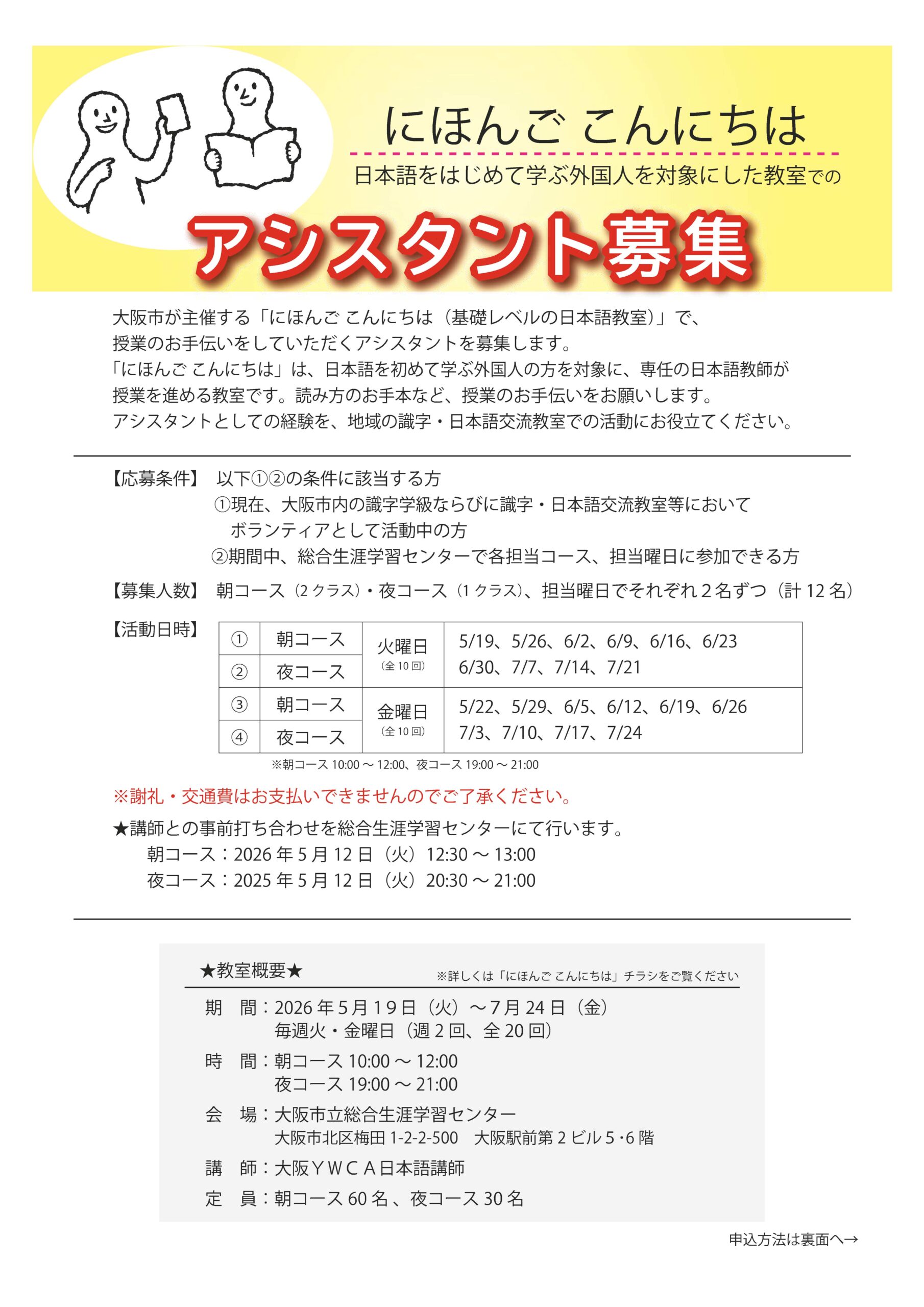 大阪市が主催する「にほんご こんにちは(基礎レベルの日本語教室)」で、授業のお手伝いをしていただくアシスタントを募集します。「にほんご こんにちは」は、日本語を初めて学ぶ外国人...
