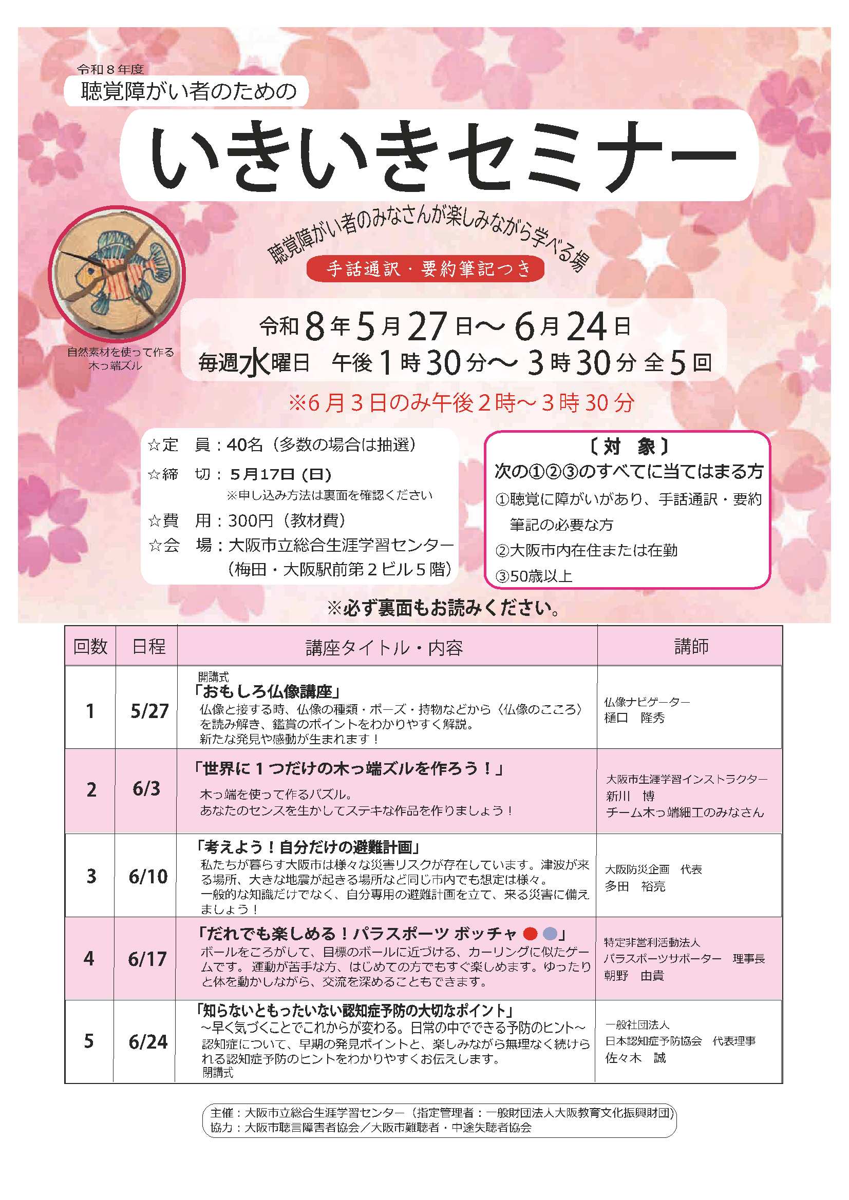 令和8年5月27日(水)~6月24日(水) 毎週水曜日 午後1時30分~3時30分 全5回 を 実施します。応募対象者は、大阪市内在住か大阪市内在勤の50歳以上で聴覚に障がいが...